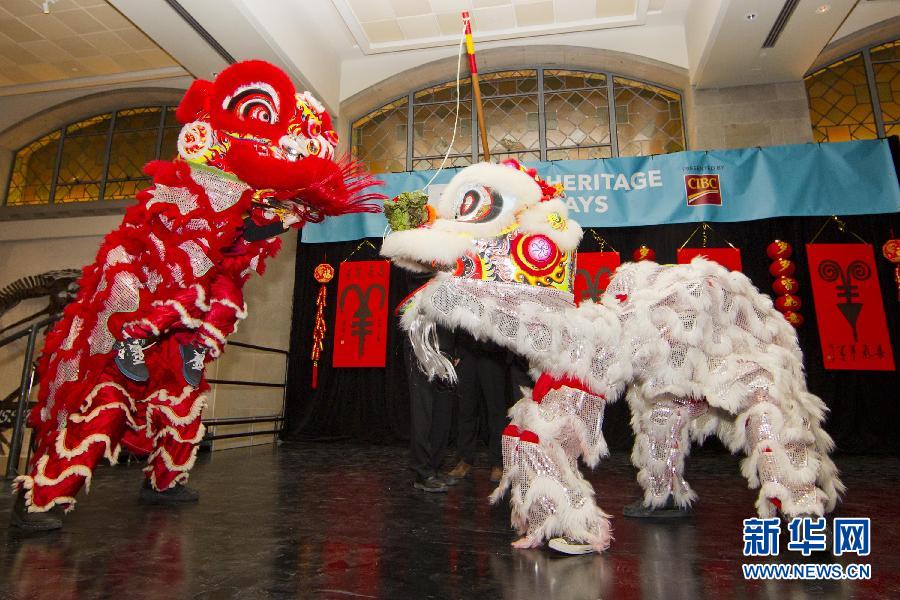 2月14日,在位于多伦多的加拿大皇家安省博物馆,表演者在活动中进行舞狮表演。当日,加拿大皇家安省博物馆与大多伦多中华文化中心联合推出“欢乐春节——三羊启泰迎新岁”活动,通过京剧表演、书画展示、茶艺交流等丰富多彩的内容,与观众共庆即将到来的中国农历羊年春节。新华社发(邹峥摄)