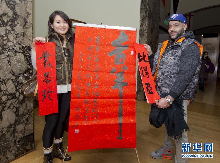 2月14日,在位于多伦多的加拿大皇家安省博物馆,两名年轻人展示在活动中获得的写有自己中文名字的帖子。当日,加拿大皇家安省博物馆与大多伦多中华文化中心联合推出“欢乐春节——三羊启泰迎新岁”活动,通过京剧表演、书画展示、茶艺交流等丰富多彩的内容,与观众共庆即将到来的中国农历羊年春节。新华社发(邹峥摄)