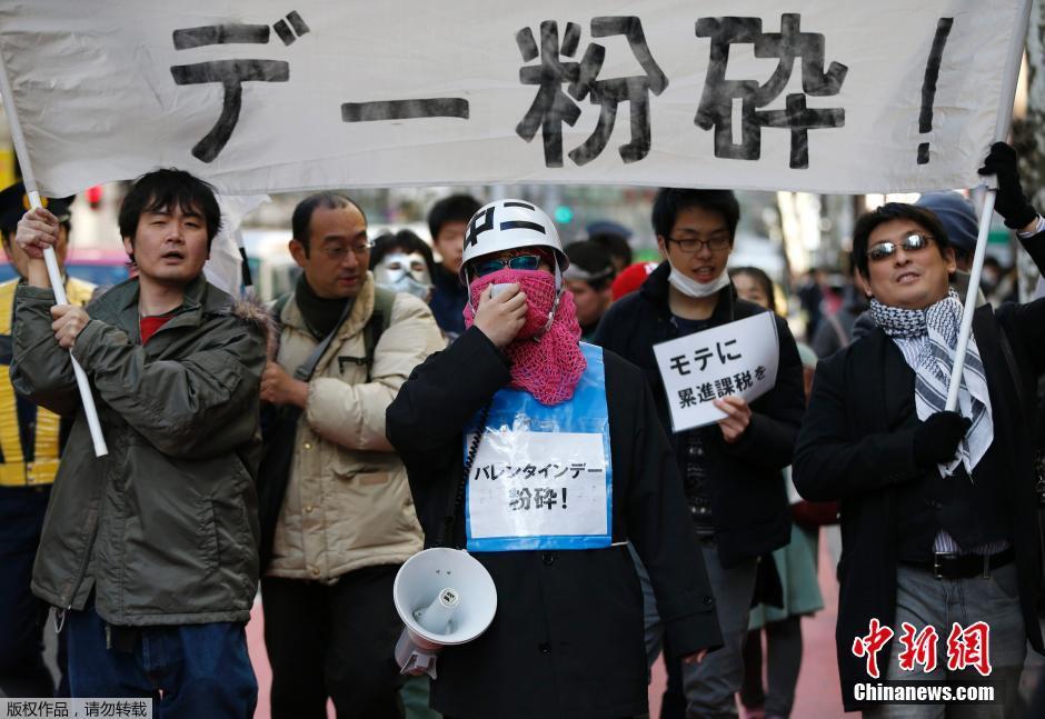 当地时间2015年2月14日,日本东京,名为“革命剩男同盟”的组织的成员举行示威活动,高举“粉碎情人节”的标语。