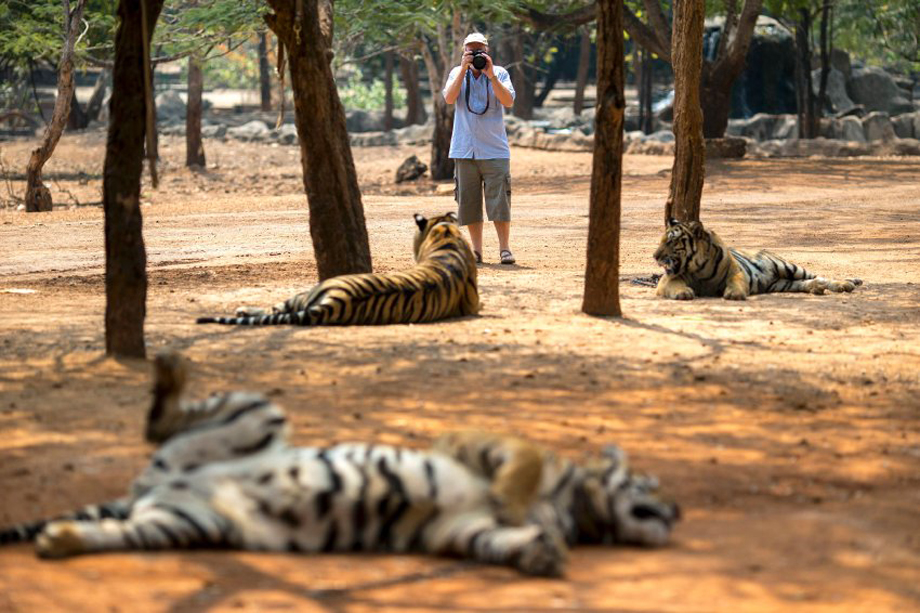在老虎寺内,游客们可以毫无顾虑地接近甚至抚摸老虎。