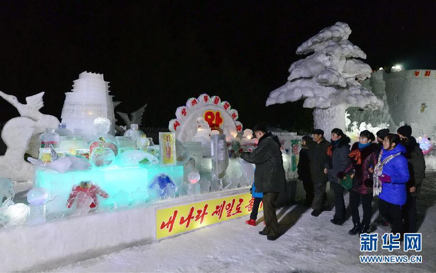 据朝中社2月13日提供的照片显示,庆祝朝鲜已故领导人金正日诞辰日(2月16日)的冰雕节5日在两江道三池渊郡拉开帷幕,朝鲜618建设突击队官兵创作并展示了1000多件冰雕作品。图片来源:新华网