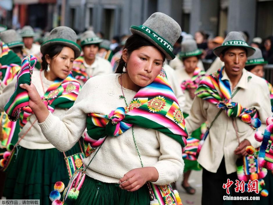 当地时间2015年2月12日,玻利维亚奥鲁罗,当地狂欢节游行举行,总统莫拉莱斯参与其中,大秀舞姿。数百个少数民族组织的队伍参加此次狂欢节。