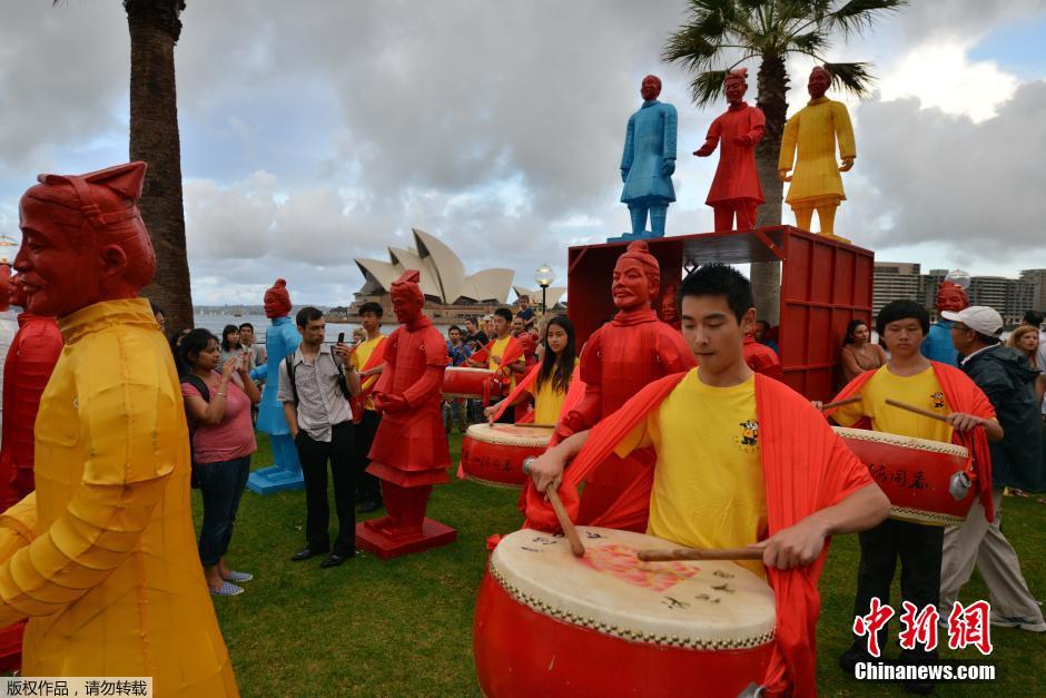 当地时间2月13日,由中国艺术家制作的五彩兵马俑灯笼点亮澳大利亚悉尼港,为当地平添了一丝节日的喜庆气氛。