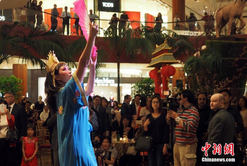 当地时间2月12日晚,有美国西部最大购物中心之称的洛杉矶南岸广场举行庆祝中国农历新年活动,新华影廊图片展以及传统京剧、变脸、武术、魔术等表演吸引众多嘉宾与参观者。 中新社发 毛建军 摄