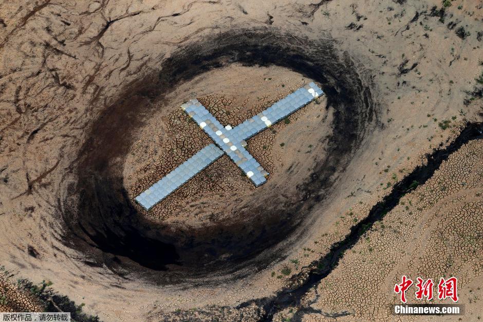 图为当地时间2月12日,圣保罗,Atibainha大坝内水上浮头,由于干旱,这些原本浮在水面的漂浮码头现在直接落在了干裂的地面上。