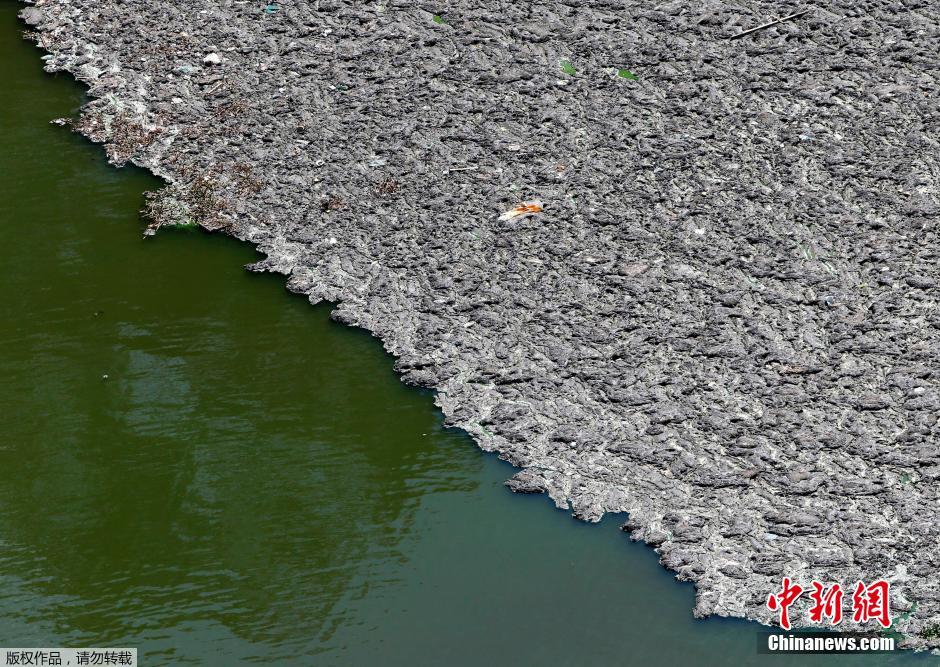 图为当地时间2月12日,圣保罗,Billings水库的水面上堆积漂浮着大量的垃圾。Billings水库给160万人供水,由于干旱造成的水资源短缺,干净的饮用水获取难度也随之增大,当地政府希望能够把干净的水资源作为商品出售。