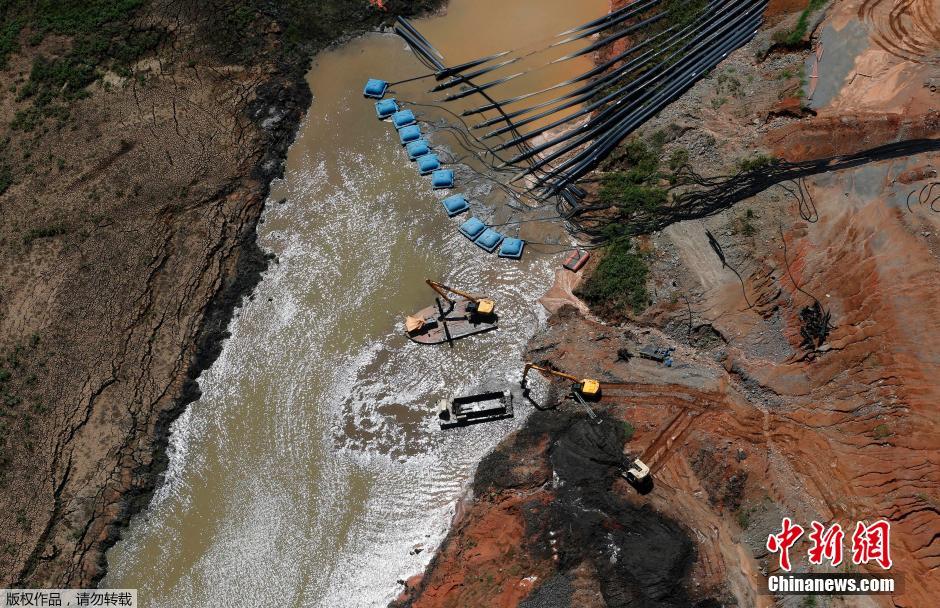 图为当地时间2月12日,圣保罗,巴西水利公司(SABESP)的工作设备在Jaguari大坝进行采水工作。