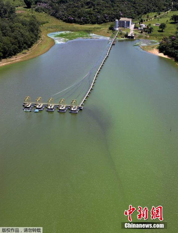图为当地时间2月12日,迪亚德马,运输船正将受污染的水从Billings水库运往Guarapiranga水库。Billings水库给160万人供水,由于干旱造成的水资源短缺,干净的饮用水获取难度也随之增大,当地政府希望能够把干净的水资源作为商品出售。