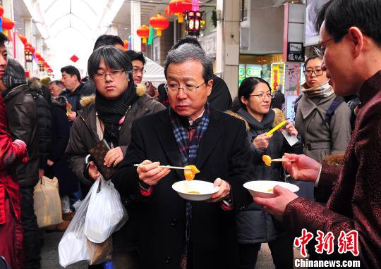 为期两天的“新澙春节祭”,2月14日开始在日本新澙市的著名传统商业街区古町举行,吸引当地众多市民冒着飞雪和严寒,一大早就前来”赶集“。图为当天出席开幕仪式的中国驻日本大使程永华,也加入了”赶集“的人流。