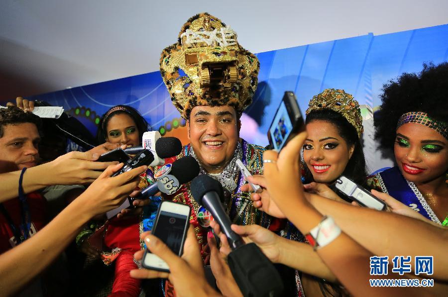 2月12日,在巴西萨尔瓦多市,狂欢节国王“莫莫王”(中)接受媒体采访。当日,巴西萨尔瓦多市2015年狂欢节开幕。新华社记者张强摄 图片来源:新华网