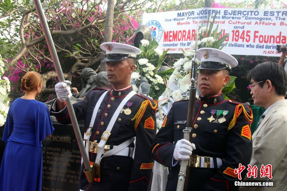 2月14日,菲律宾“铭记马尼拉1945基金会”在马尼拉举办活动,纪念马尼拉战役70周年。图为马尼拉市政府代表向10万遇难平民纪念碑敬献花圈(左1),日本民间团体“和平之桥”当天也派代表(右1)出席纪念活动。1945年2月3日至3月3日,在太平洋地区发起反攻的美军进攻马尼拉,被包围在城内的日本军队作困兽斗,有计划地屠杀平民,烧杀奸淫无恶不作,一个月内屠杀了包括老弱妇孺在内约10万平民。中新社发 张明 摄