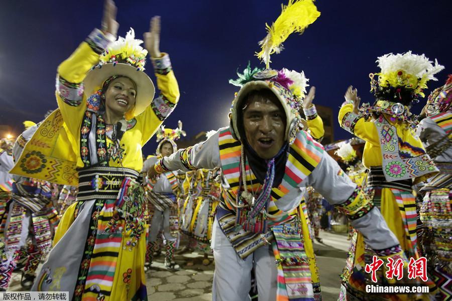 狂热奔放的南美狂欢节闪亮登场,载歌载舞的民众脸上写满了喜悦。图为2月14日,玻利维亚奥鲁罗省的狂欢节现场。