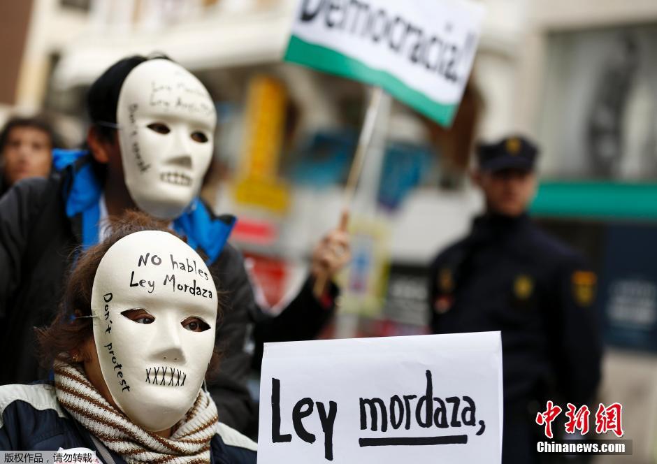 当地时间2015年2月14日,西班牙马德里,西班牙示威者游行抗议政府颁布新的反示威安全法。西班牙议会在2014年12月11日批准该法案。