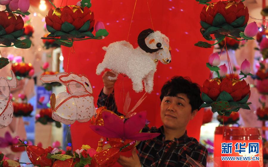 2月15日,在江苏省扬州市一商场,售货员在摆放新上市的“羊灯”。羊年春节临近,一批由扬州手工艺人打造的羊造型的装饰灯俏销当地市场,为节日增添了喜庆氛围。 新华社发(濮良平 摄)