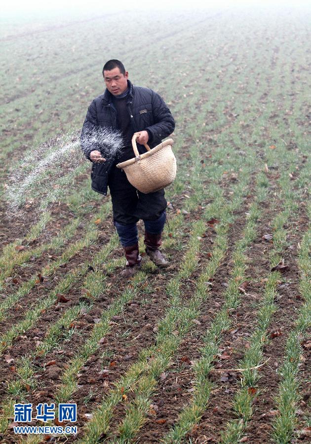 2月15日,在山东省临沂市郯城县郯城街道米庄村,农民米成富在雨后为麦田施肥。 当日,山东临沂、枣庄等地小麦产区喜降春雨。新华社发(张春雷 摄)