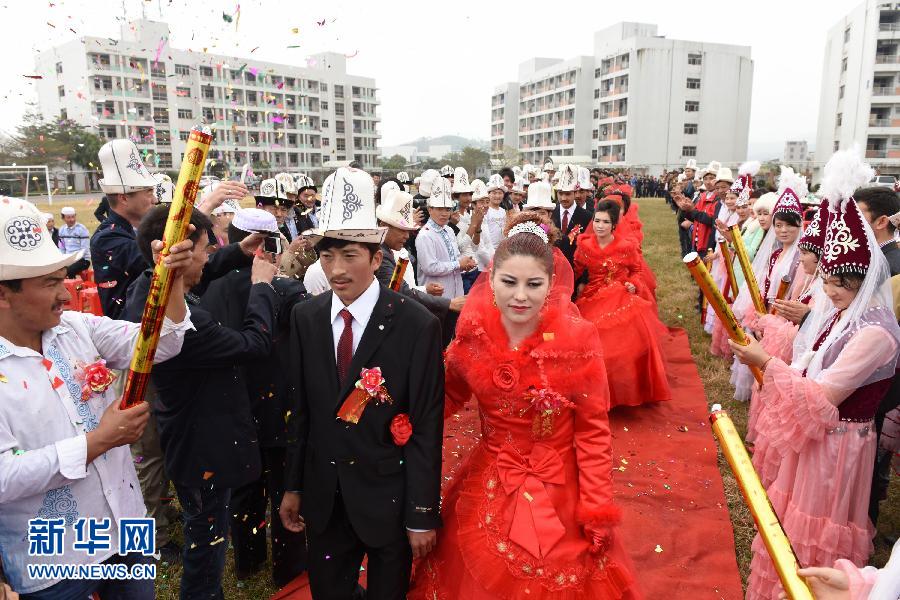 2月15日,6对柯尔克孜族新人们携手走进婚礼现场。当日,新疆阿克陶县赴广东省惠州市柯尔克孜族务工青年集体婚礼在惠州大统营科技有限公司举行,6对柯尔克孜族在粤务工青年喜结连理,他们的家人也从新疆赶来参加了儿女们的婚礼。据介绍,这是自2013年开始,阿克陶县为到内地务工的青年举行的第三次集体婚礼。2014年,阿克陶县有2991人转移到内地工厂就业,成为产业工人。新华社记者 梁旭 摄