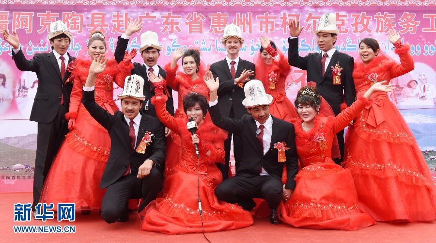 2月15日,6对柯尔克孜族新人一起合影留念。当日,新疆阿克陶县赴广东省惠州市柯尔克孜族务工青年集体婚礼在惠州大统营科技有限公司举行,6对柯尔克孜族在粤务工青年喜结连理,他们的家人也从新疆赶来参加了儿女们的婚礼。据介绍,这是自2013年开始,阿克陶县为到内地务工的青年举行的第三次集体婚礼。2014年,阿克陶县有2991人转移到内地工厂就业,成为产业工人。新华社记者 梁旭 摄