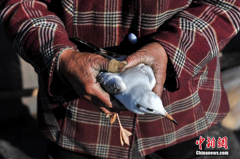 图为杨水兰用她粗糙的手让许多红嘴鸥康复。 中新社发 任东 摄