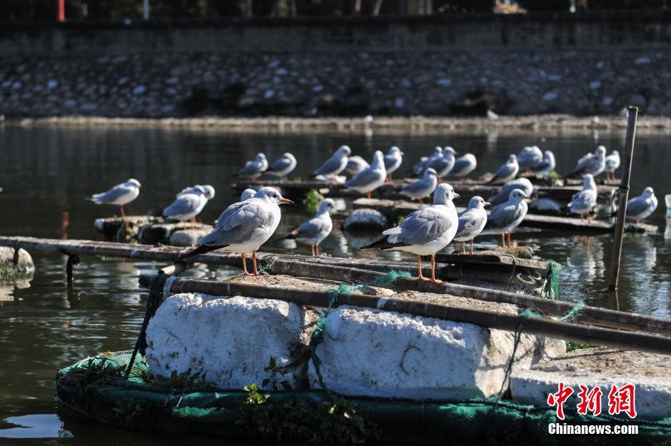 图为红嘴鸥在杨水兰的舢板上停靠。 中新社发 任东 摄
