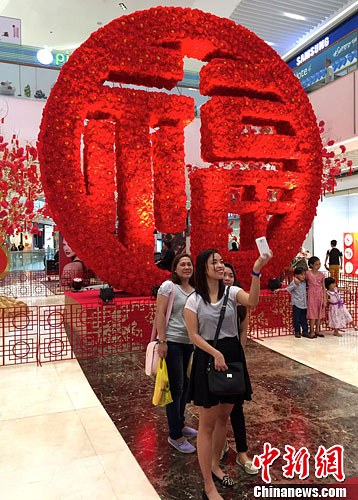 2月15日,菲律宾首都大马尼拉地区塔义格市环球城一家大型购物商场搭设起巨型大红“福”字,众多民众争相留影,期盼纳福。中新社发 张明 摄