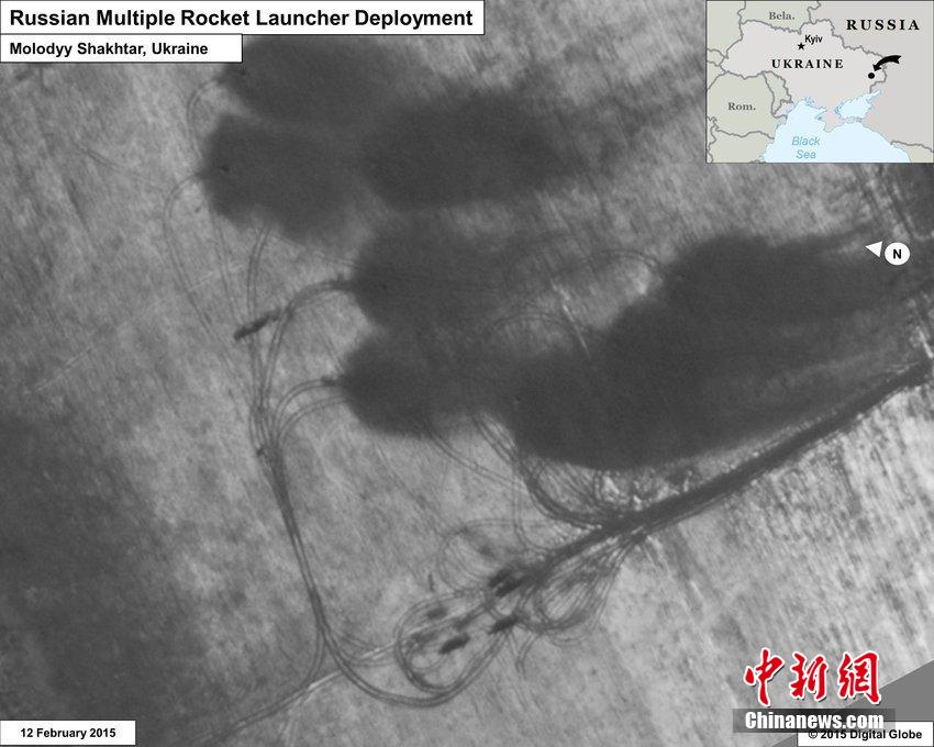2015年2月15日消息,美国政府14日公布了一些卫星图片,称这些图片显示出俄罗斯向乌克兰东部民间武装运送大炮及防空系统。据报道,美国驻乌克兰大使皮亚特(Geoffrey Pyatt)日前在推特上公布了上述黑白卫星图片。他称,奥巴马政府“确信”卫星图片中显示的所有武器装备都属于俄罗斯,而非乌东部民间武装。图片来源:CFP视觉中国