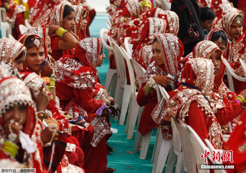 当地时间2月15日,印度艾哈迈达巴德,191对穆斯林夫妇参加了一个社会组织举办的集体婚礼。图为新娘们在等待中聊天。