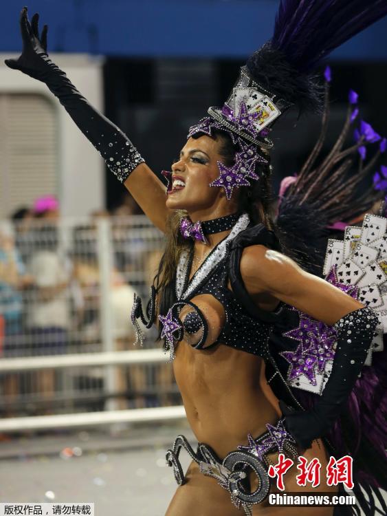 当地时间2015年2月15日,巴西圣保罗,巴西狂欢节庆祝进入第三天,桑巴舞学校的舞者参加游行。