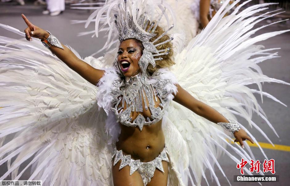 当地时间2015年2月15日,巴西圣保罗,巴西狂欢节庆祝进入第三天,桑巴舞学校的舞者参加游行。