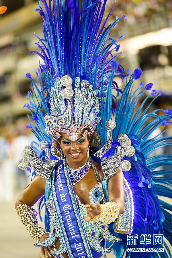 2月14日,在巴西里约热内卢,本年度“狂欢公主”在狂欢节游行上领舞。当日,八支来自入门组桑巴舞校的队伍陆续登场竞技,入门组比赛于当晚全部结束。特级组桑巴舞校的角逐将于15日晚间上演。 新华社记者徐子鉴摄
