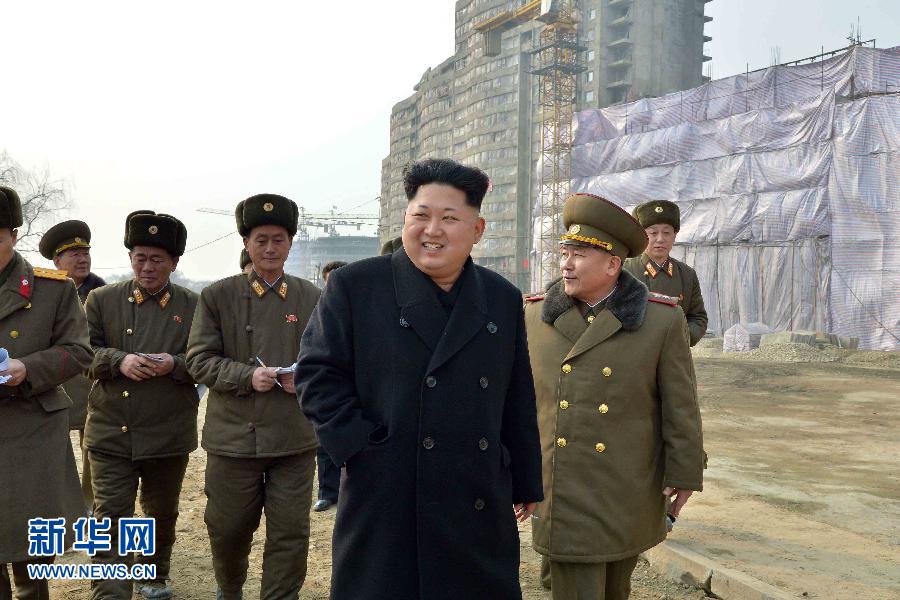 朝中社2月15日提供的照片显示,朝鲜最高领导人金正恩(前)视察位于平壤大同江畔的未来科学家社区建设工地。朝鲜最高领导人金正恩日前乘专机俯瞰未来科学家社区建设工地后,到现场指导了建设工作。金正恩在未来科学家社区鸟瞰图前听取解说后,察看第77号栋3楼1号和地源热取水泵房等各处,具体了解了一期工程情况,并确定二期项目及其规模。新华社/朝中社