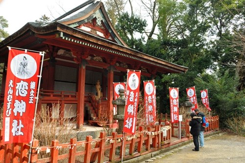 此外,位于樱井市的谈山神社的摄社中也有一座名副其实的“爱情神社”。神社供奉的是因大化改新而家喻户晓的中臣镰足之正室镜女王(镜王女)。据说,只要走一走连结拜殿下的鸟居和“爱情神社”间的“爱情之路”,恋情便能很快实现。