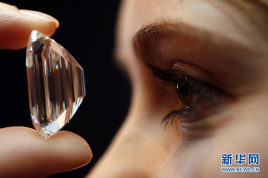 2月13日,在英国伦敦苏富比拍卖行,一名工作人员展示一颗重达100克拉的祖母绿切割钻石。 新华社/路透