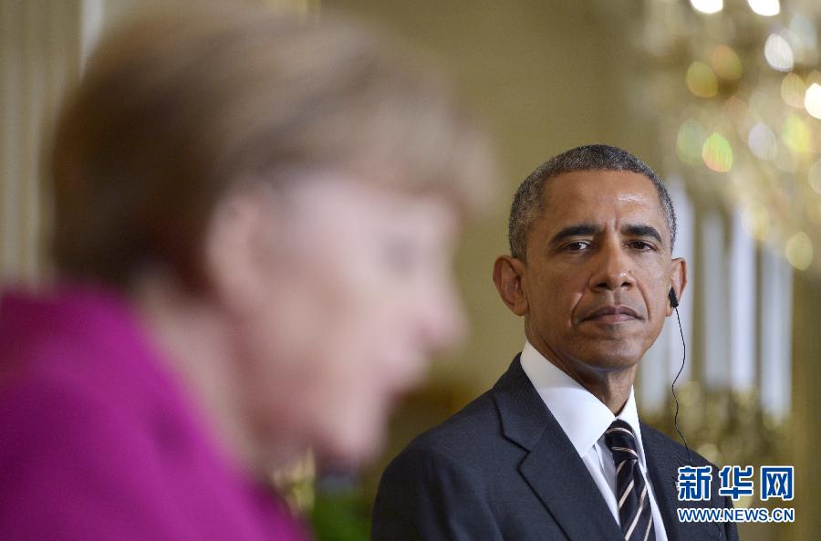 2月9日,美国总统奥巴马(右)和到访的德国总理默克尔在华盛顿白宫出席联合新闻发布会。美国总统奥巴马和到访的德国总理默克尔9日在白宫举行会谈后表示,他们将继续寻求通过外交途径解决乌克兰危机。奥巴马还强调,他尚未决定是否向乌克兰政府提供致命武器援助。新华社记者殷博古摄