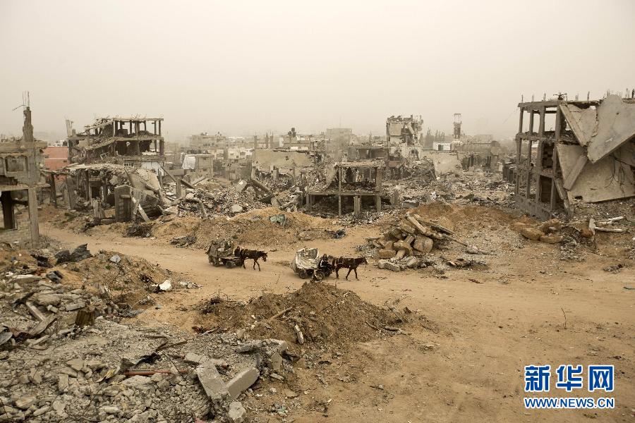 2月11日,在加沙城,两辆驴车走过一片废墟。 新华社/法新