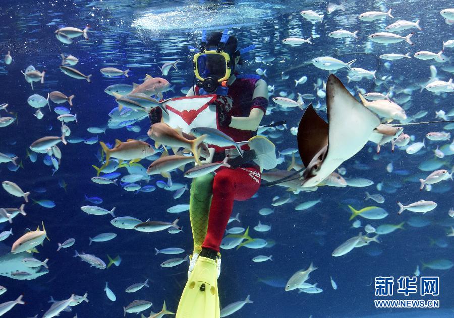 2月10日,在日本东京的阳光水族馆,一名潜水员在水族箱中手持信封道具表演,为即将到来的情人节预热。 新华社/法新