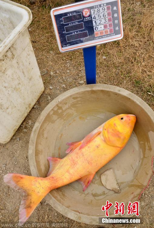 2015年2月14日,安徽省巢湖市,夏阁镇养鱼户姚师傅在自家鱼塘清塘时,意外捕获一条通体金红的鳙鱼(胖头鱼)。该鱼身长85公分,背鳍到鱼腹宽度约30公分,体重整整13斤。从外观上看,这条鱼与平时吃的胖头鱼没有什么两样,但颜色上却与正常的胖头鱼完全两样,非常有观赏价值。图片来源:东方IC 版权作品