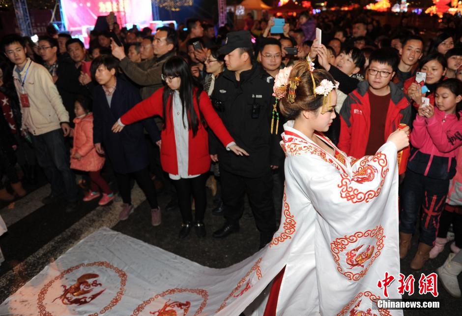 2月15日晚,“大唐”祈福会在湖南长沙梅溪湖举行,吸引了众多市民围观。现场的一位美女装扮成武媚娘在开口笑祈福树下进行祭天仪式,祝愿祖国国泰民安、繁荣昌盛。 中新社发 杨华峰 摄