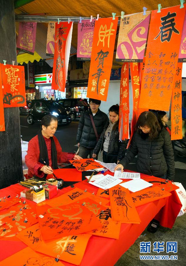 2月15日晚,在台北市迪化街上,市民在选购春联。春节临近,台北市年货一条街——迪化街的夜晚人头攒动,热闹非凡。 新华社记者 金立旺摄