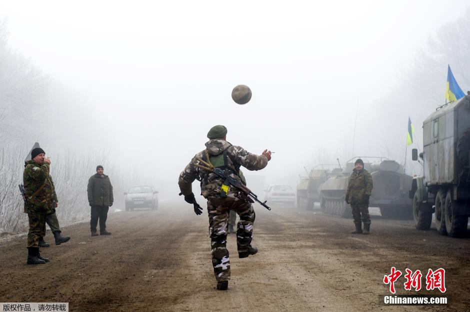 当地时间2015年2月15日,乌克兰Svitlodarsk,乌克兰停火协议生效,乌克兰士兵在前往顿巴利采沃的途中扎营休息,几名士兵踢起了足球。