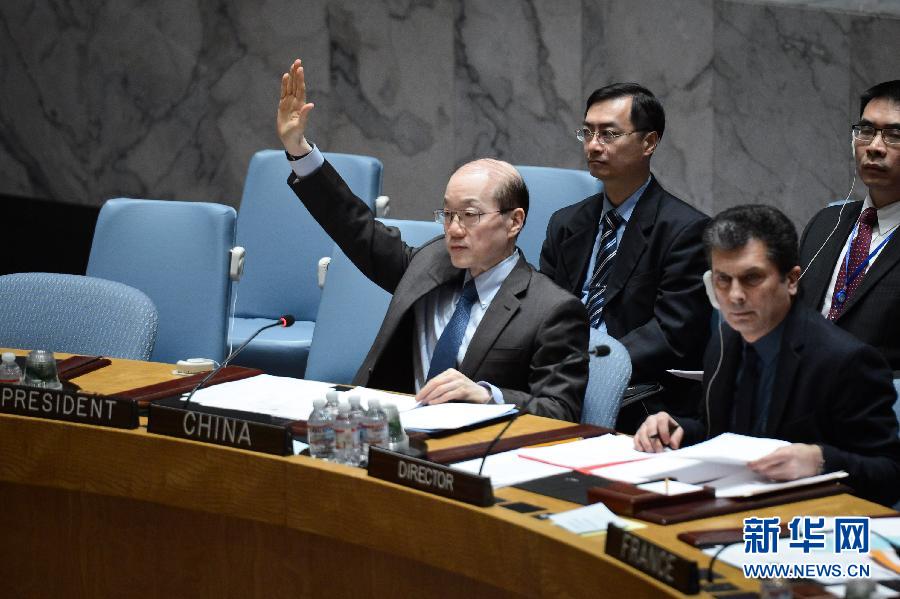 2月15日,在纽约联合国总部,安理会轮值主席、中国常驻联合国代表刘结一(左)投票赞成安理会关于也门局势的决议。联合国安理会当日就也门局势召开紧急会议并一致通过决议,敦促也门胡塞武装组织从政府机构撤出并无条件参加联合国斡旋的谈判。新华社记者牛晓雷摄