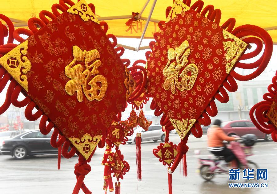 2月16日,在山东省滨州市邹平县,行人从一年货市场悬挂的福字旁经过。新春佳节临近,我国各地城乡张灯结彩,喜气洋洋。 新华社发(董乃德 摄)