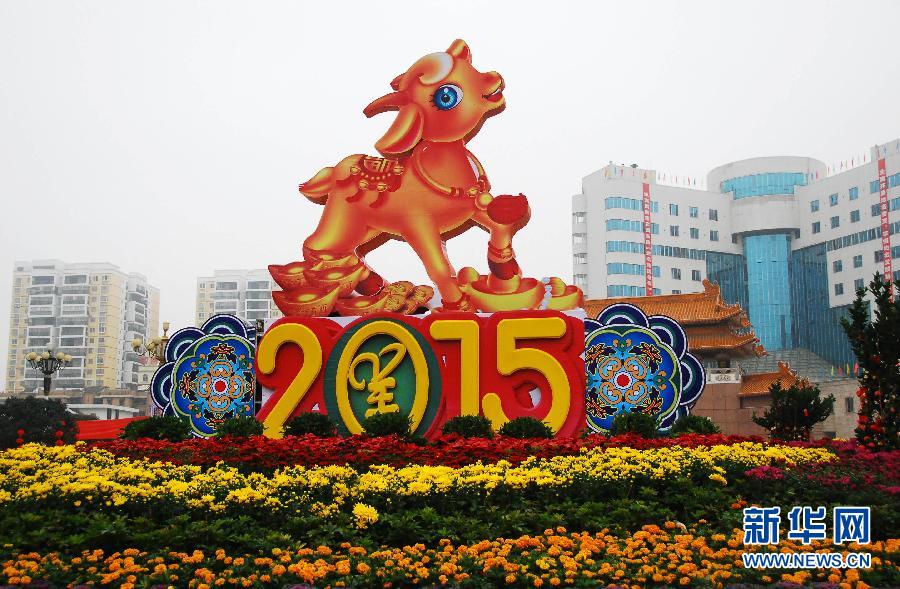 这是2月16日拍摄的广西贺州市八步区街头的羊年主题花坛造型。新春佳节临近,我国各地城乡张灯结彩,喜气洋洋。 新华社发(廖祖平 摄)