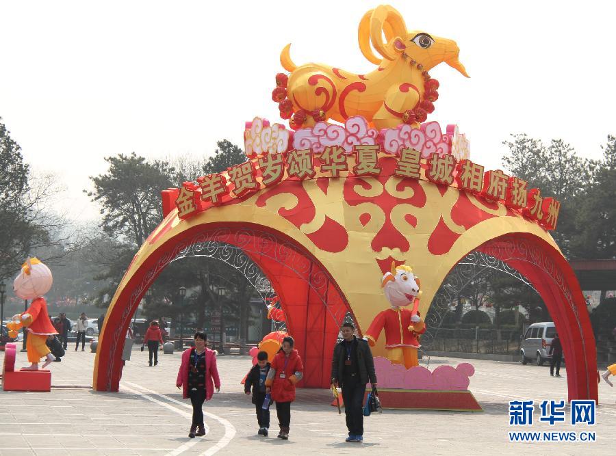 2月15日,山西省阳城县著名风景区皇城相府所在的北留镇皇城村村民从村中的喜庆装饰旁经过。新春佳节临近,我国各地城乡张灯结彩,喜气洋洋。 新华社发(陈元梓 摄)