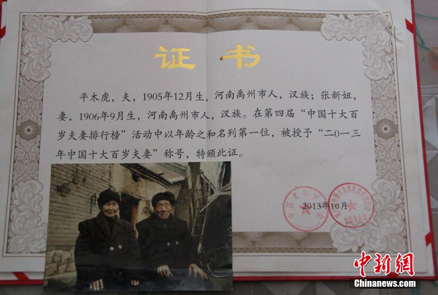 中国老年学会为老夫妻颁发的“中国最长寿夫妻”证书。朱清 摄