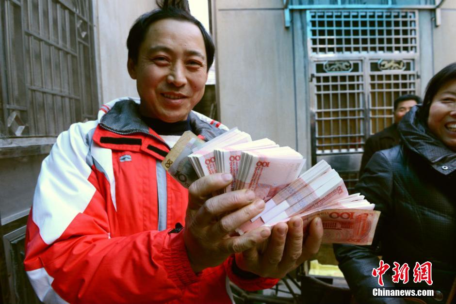 夏老板亲友们兴高采烈地搬运发放工人工资的现金款。严公轩 摄