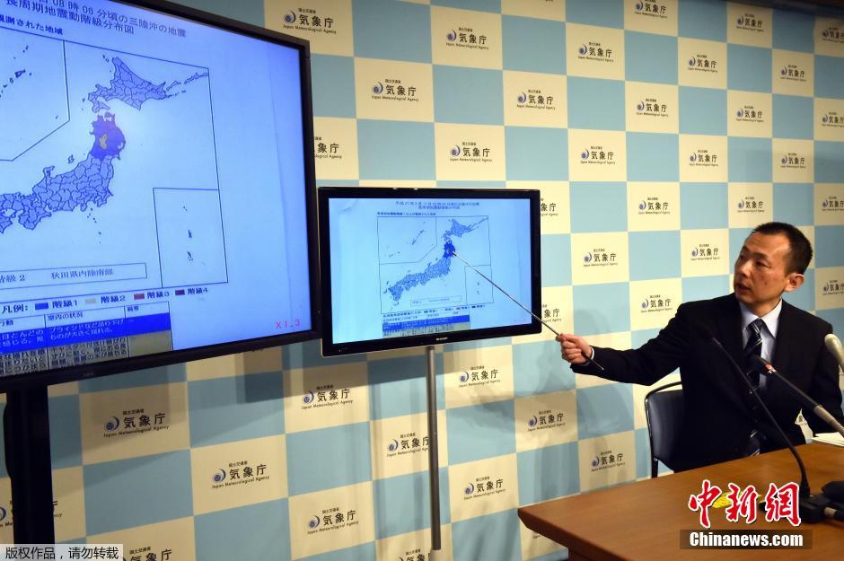北京时间17日7时6分,日本宫古东部220公里处发生6.9级地震,震源深度10公里。图为日本气象厅举行发布会现场。