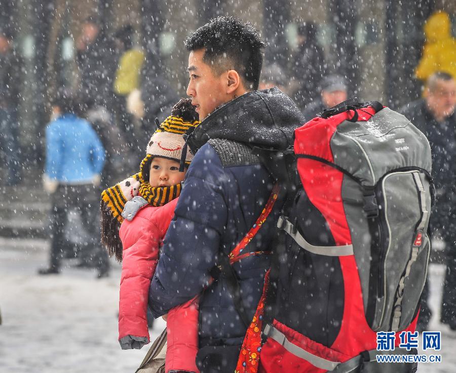 2月16日,在长春火车站站前广场,一位父亲抱着他的女儿前往候车大厅。据了解,长春火车站16日发送旅客近8.5万人次。新华社记者 许畅摄