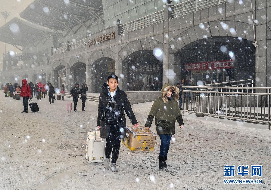 2月16日,在长春火车站站前广场,旅客们拎着行李前往车站候车大厅。据了解,长春火车站16日发送旅客近8.5万人次。新华社记者 许畅摄