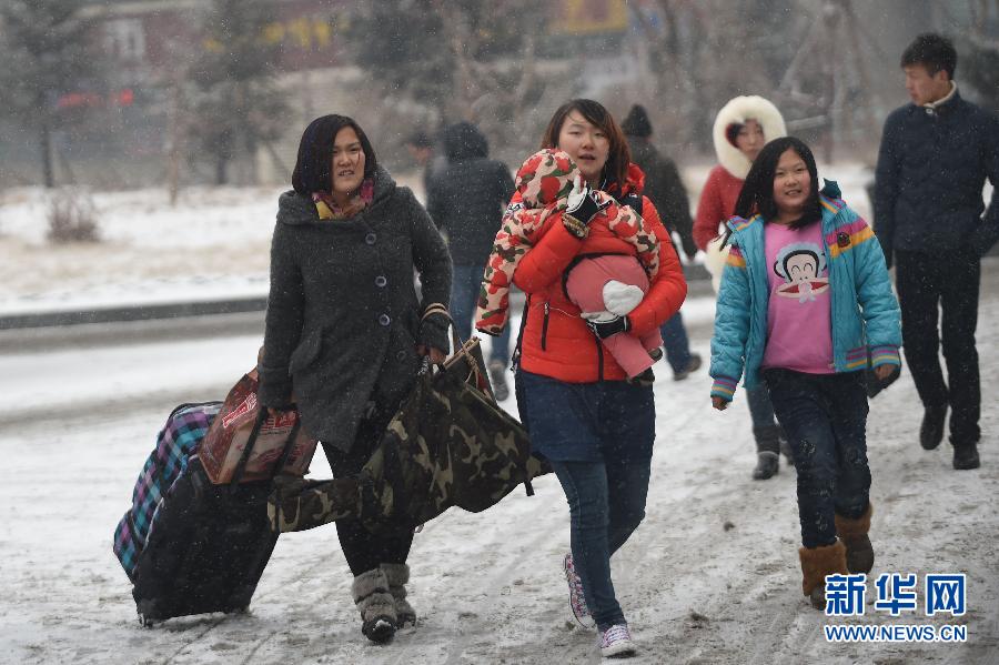 2月16日,旅客冒雪走在沈阳北站站前广场上。新华社记者潘昱龙摄