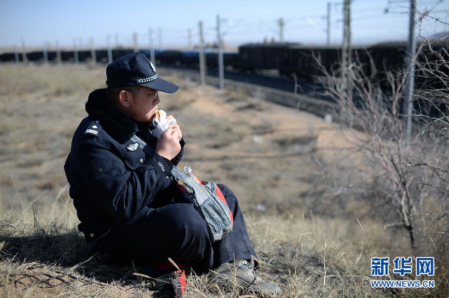 2月12日,葛志军在宁夏中卫市沙坡头区迎水桥镇铁路边的沙丘上吃饭。一瓶白水,一个干馍馍就是他巡线的餐食。今年47岁的葛志军是兰州铁路公安局银川铁路公安处中卫市沙坡头警务区的一名普通民警。20年的从警生涯里,葛志军在2个基层派出所和7个基层警务区工作过。目前葛志军值守的沙坡头警务区是包兰铁路线沙漠铁路路段,站点只有他一个民警,每天巡线近40公里的沙漠路段,还要巡查沿线的防护林防火工作,春运期间更是加大巡查力度。20年来,他没有与家人度过一个团圆年。新华社记者 王鹏 摄